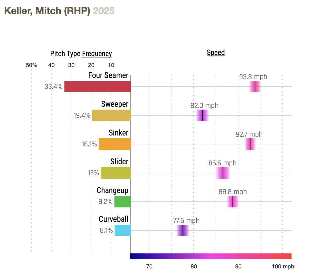 Largely, the W-L record is because Keller has the second-lowest run support of any qualified starter, 131st of 132, just ahead of his teammate Andrew Heaney. The Pirates haven’t scored more than two runs in any of Keller’s last seven starts. The Pirates are 1-6 in those games.