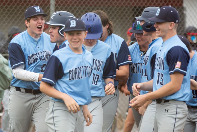 Burgettstown players celebrate after Brian Charles, second from left, hit a grand slam in the third inning of a 12-11 win against Fort Cherry on Tuesday, May 6, 2025, at Fort Cherry High School. (Emily Matthews/Pittsburgh Union Progress)