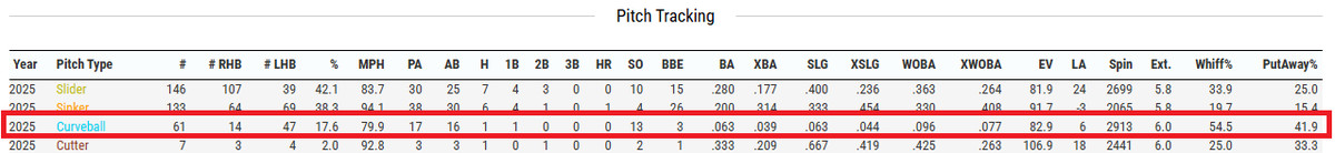 His pitches are showing more movement than he’s been previously able to generate as his slider is breaking always almost seven inches more than most comparable pitches, while his curveball drops almost five full inches more than his contemporaries’. The movement that he’s generating from his main assortment has baffled opposing hitters, as he’s been able to get more out-of-the-zone swings, more whiffs, and less contact than any of his previous years in MLB.