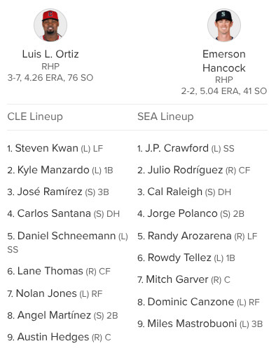Emerson Hancock gets the ball for the Mariners, hoping to continue his run of competence since returning from Tacoma. Luis L Ortiz pitches for Cleveland. Despite throwing a lot of fastballs, Ortiz has some trouble with command, which could be a nice fit for this Mariners lineup. Or at least it would be if MLB’s preeminent strike-stealer weren’t catching for the Guardians today. Swing if it’s close, boys.