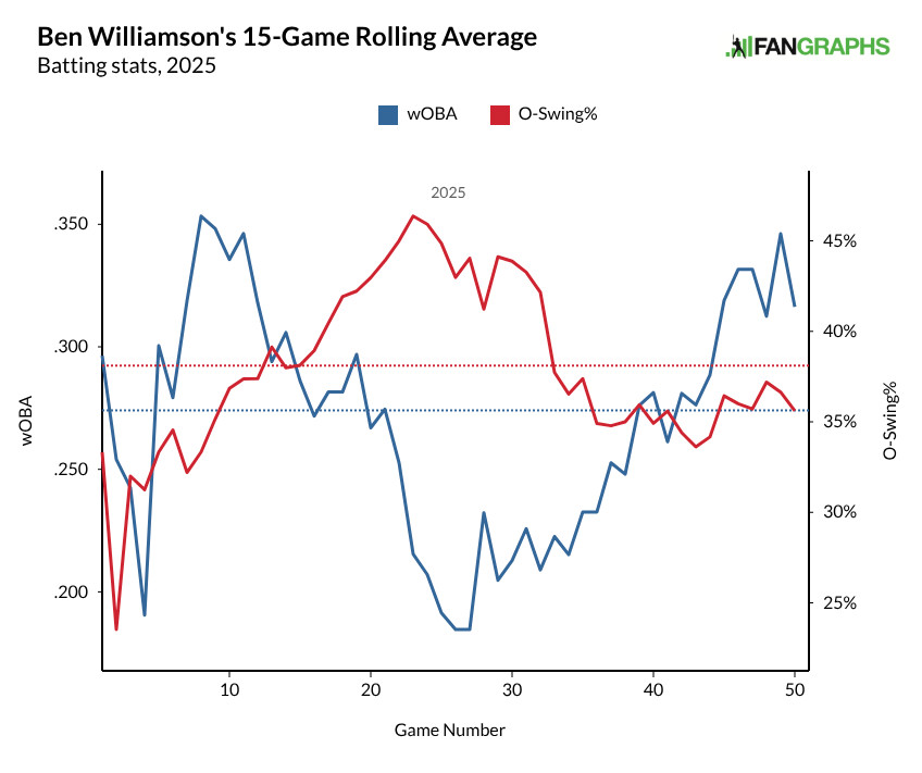 Before we get to the lineups, I have a couple charts. The first is one I mentioned on yesterday’s Meet at the Mitt, showing that Williamson has adjusted to his chase problem (for now) and is being rewarded with better results (for now).