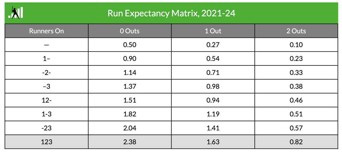 Here’s a table I’m taking from FanGraphs showing the run expectancy for every base-out situation from 2021-2024, including those two data points from above. Note that I’m using averages from a multiyear span because there’s a little less noise than there is from the 2025 data, which is similar but a little weird in places.