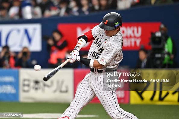 OSAKA, JAPAN – MARCH 06: Designated hitter Munetaka Murakami of Samurai Japan hits a RBI single in the 1st inning against Team Europe at Kyocera Dome Osaka on March 6, 2024 in Osaka, Japan. (Photo by Kenta Harada – SAMURAI JAPAN/SAMURAI JAPAN via Getty Images)