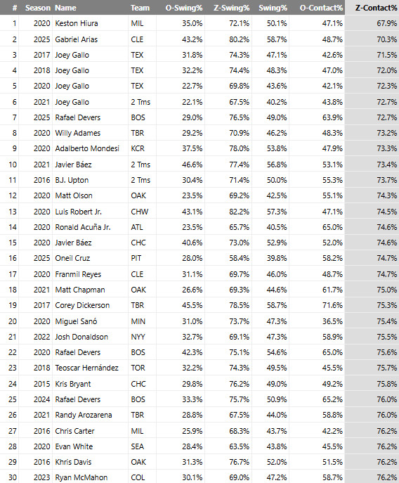 So, I take a little solace here because there are some guys on here who have wound up being okay despite having seasons with lots of swing and miss in the zone (Willy Adames, Ronald Acuna Jr., Luis Robert, Matt Chapman) — but only a little. There are a couple of caveats, as you can see: