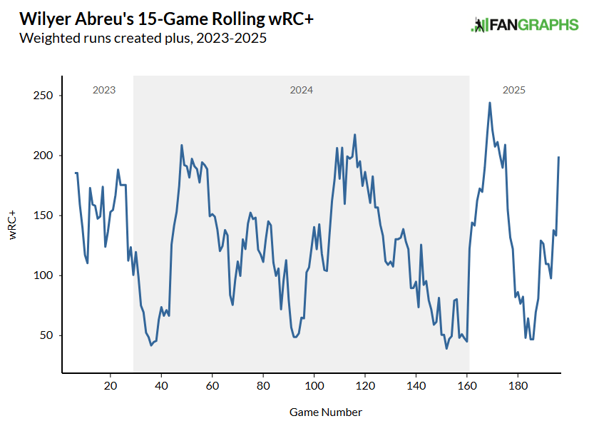 Wilyer Abreu has a cool set of red sliders on his Baseball Savant page, but it doesn’t really change the fact that his history suggests he is a notoriously streaky platoon bat and that so far in 2025 we haven’t seen anything that Abreu hasn’t done before.