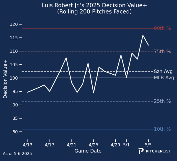 Luis Robert Jr. is the toughest guy in baseball to rank, but it’s much easier when he’s getting on base more consistently thanks to an incredible improvement in his walk and chase rates, as reflected in his Decision Value below.