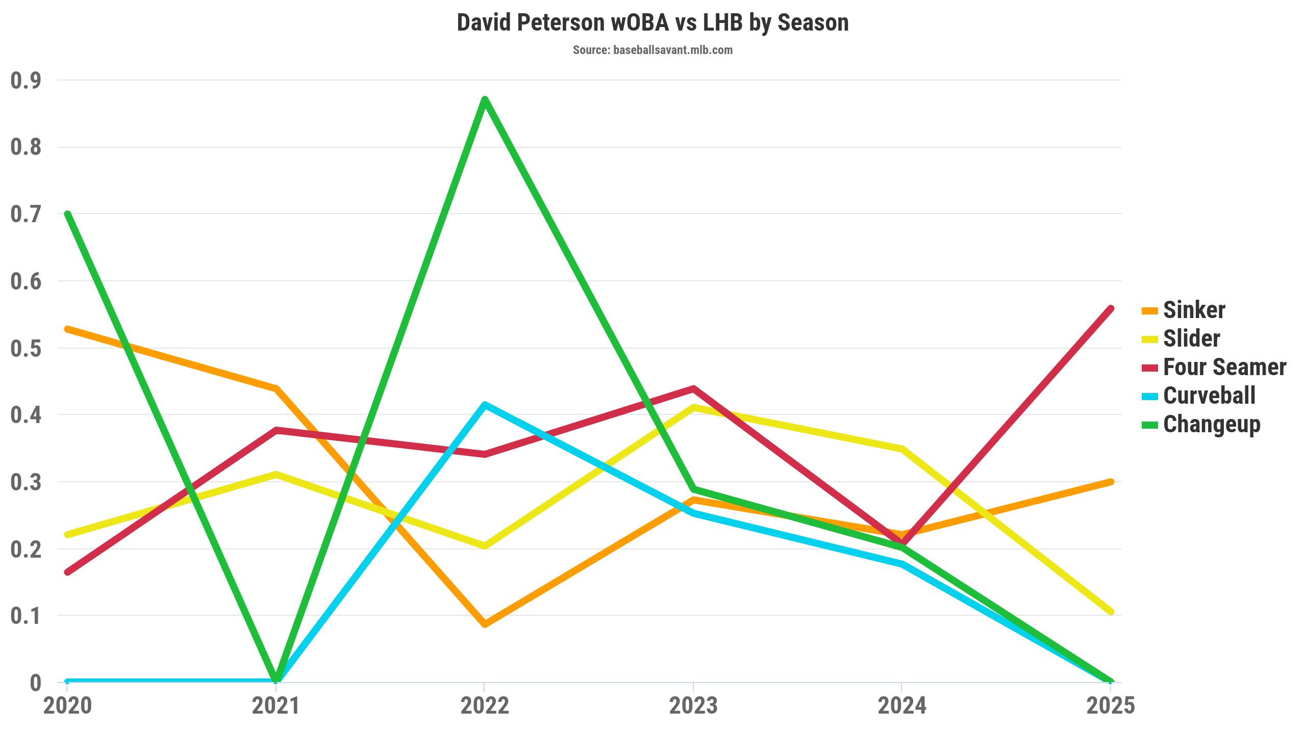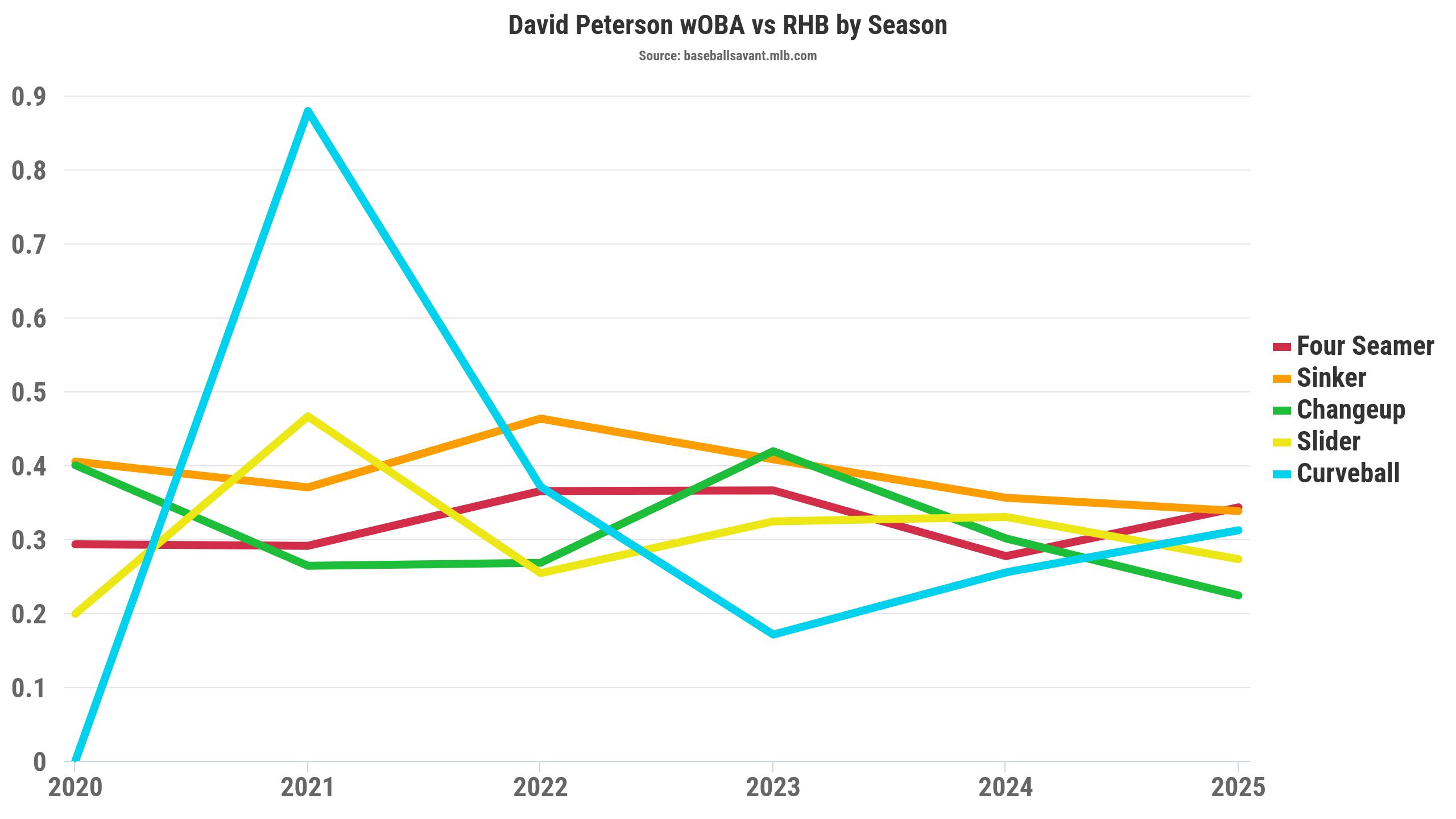 However, Peterson’s batted ball outcomes have improved against the slider for both sides of the plate in 2025. Besides Peterson’s slider, one might wonder what else he brings to the table with his arsenal. Peterson’s changeup (11.3 percent) and curveball (11.9 percent) typically were the two other decent offerings in swinging strike rates.