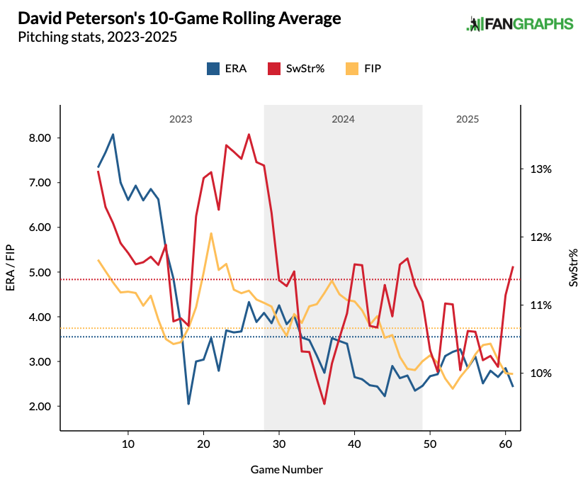 However, it’s worth noting Peterson boasts a 12 percent swinging strike rate in May with 12.7 percent in June, giving us slightly more confidence if he maintains the whiffs. Peterson’s slider has been feasting, with a 19.9 percent swinging strike rate in 2025, leading his arsenal and close to his career average (20.7 percent). The batted ball results against the slider against left-handed hitters (.105 wOBA, .144 xwOBA) have been better than his outcomes against right-handed hitters (.273 wOBA, .264 xwOBA).