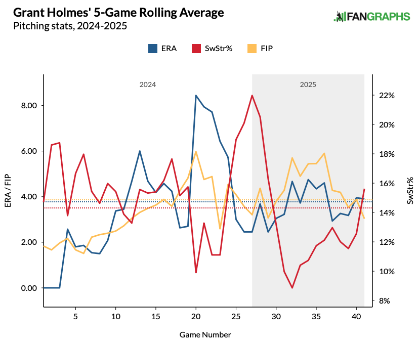 For context, Holmes rocks a 3.40 xERA (3.97 ERA), 17 percent K-BB percentage, and a 13.1 percent swinging strike rate in 2025. Holmes has a similar xERA to 2024 (3.65), yet his K-BB percentage (19 percent) and swinging strike rate (16.5 percent) fell from the 2025 numbers.