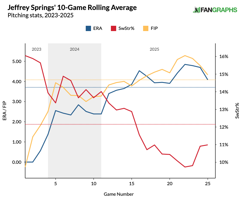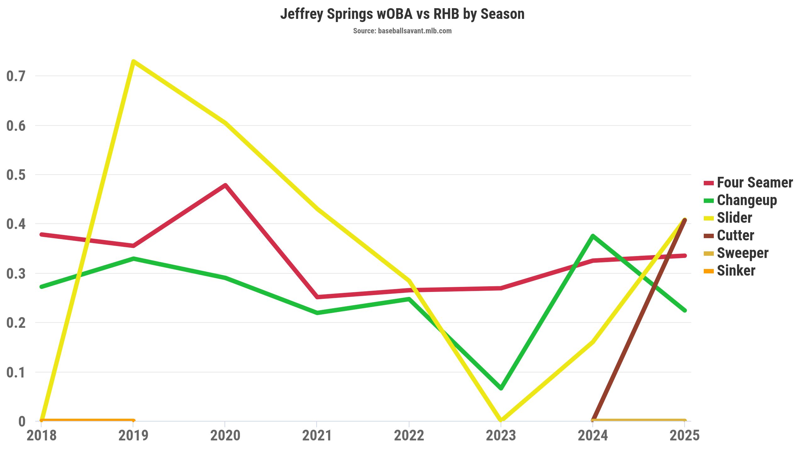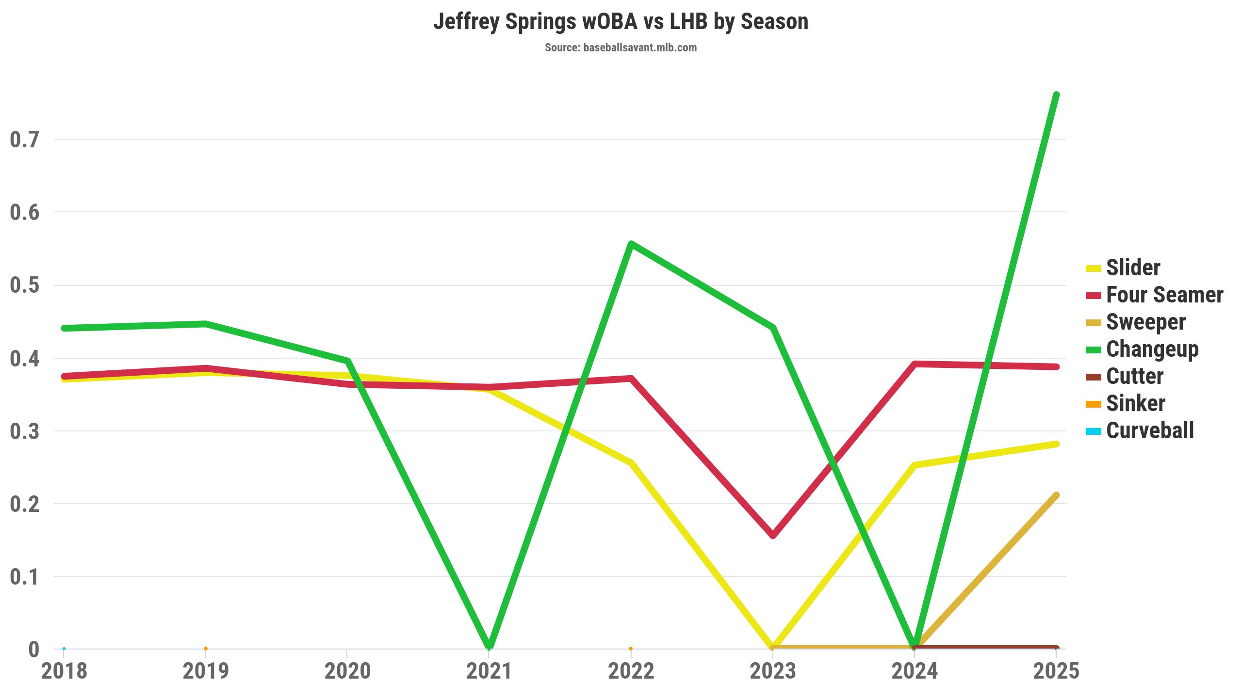 The changeup for Springs has been deadly, with a 24.5 percent swinging strike rate in 2025, similar to his career norm. Besides the changeup, Springs lacks any other offering with a swinging strike rate in the double digits. That makes Springs somewhat of a one-pitch pitcher.
