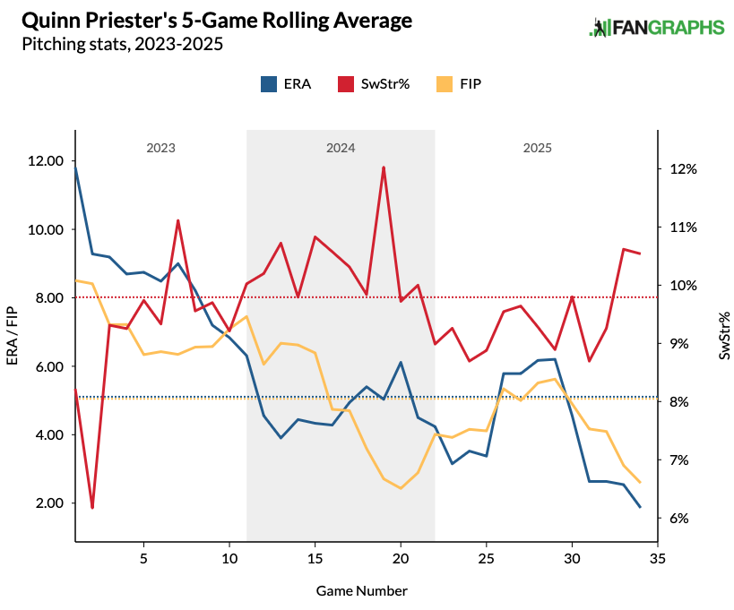 However, Priester has been pretty solid over the past five outings from May 24, allowing a 1.86 ERA, 2.59 FIP, 0.93 WHIP, 15.3 percent strikeout minus walk rate, and a 10.5 percent swinging strike rate. For context, Priester has a 7 percent strikeout minus walk rate and a 9.8 percent swinging strike rate in 2025, so we’ve seen some slight gains over the past month.