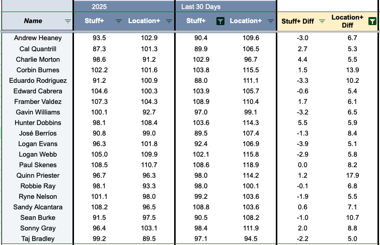 The visual below shows the starting pitchers with a five-point increase in their Location+ over the last 30 days compared to the 2025 season, with a minimum of 10 innings. Priester made this list.