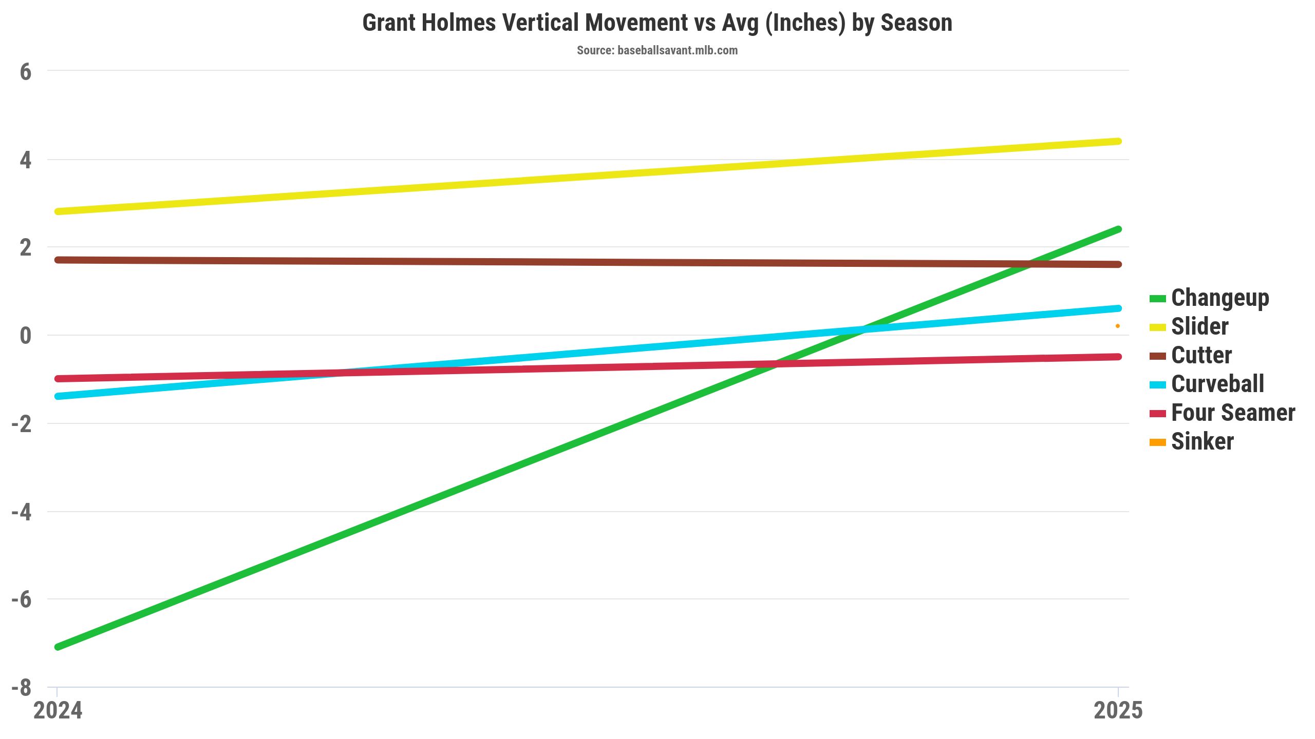 Holmes’ slider (23.5 percent) and curveball (22.5 percent) swinging strike rates were dominant in 2024. However, he maintained the slider whiffs (21.7 percent), yet saw his curveball whiffs disappear to a 14.8 percent swinging strike rate in 2025. Holmes’ slider added three inches of downward movement, theoretically leading to more whiffs and weak contact. Meanwhile, Holmes’ curveball gained three inches of drop and an inch of glove-side sweep.