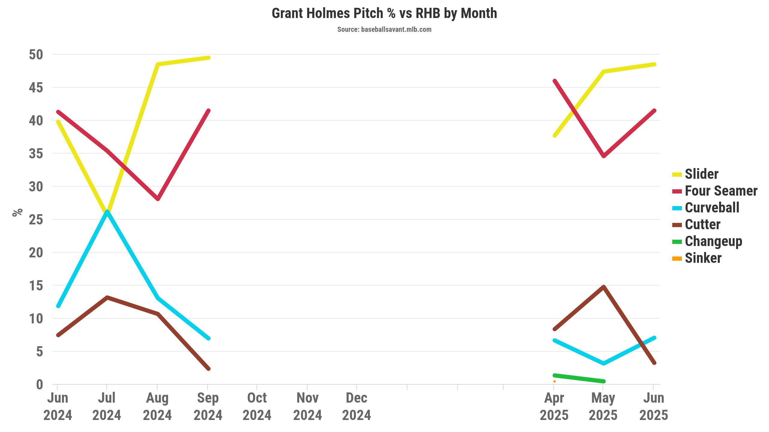 Holmes throws his curveball most often against left-handed hitters (24.6 percent), leading to quality results. That’s evident in Holmes’ curveball wOBA being .258 (.224 xwOBA) against left-handed hitters in 2025. Meanwhile, Holmes consolidated his approach to right-handed hitters, with sliders (44.1 percent) and four-seamers (40.2 percent). He threw more sliders and four-seamers toward right-handed hitters in 2025 while lowering the cutter and curveball usage.