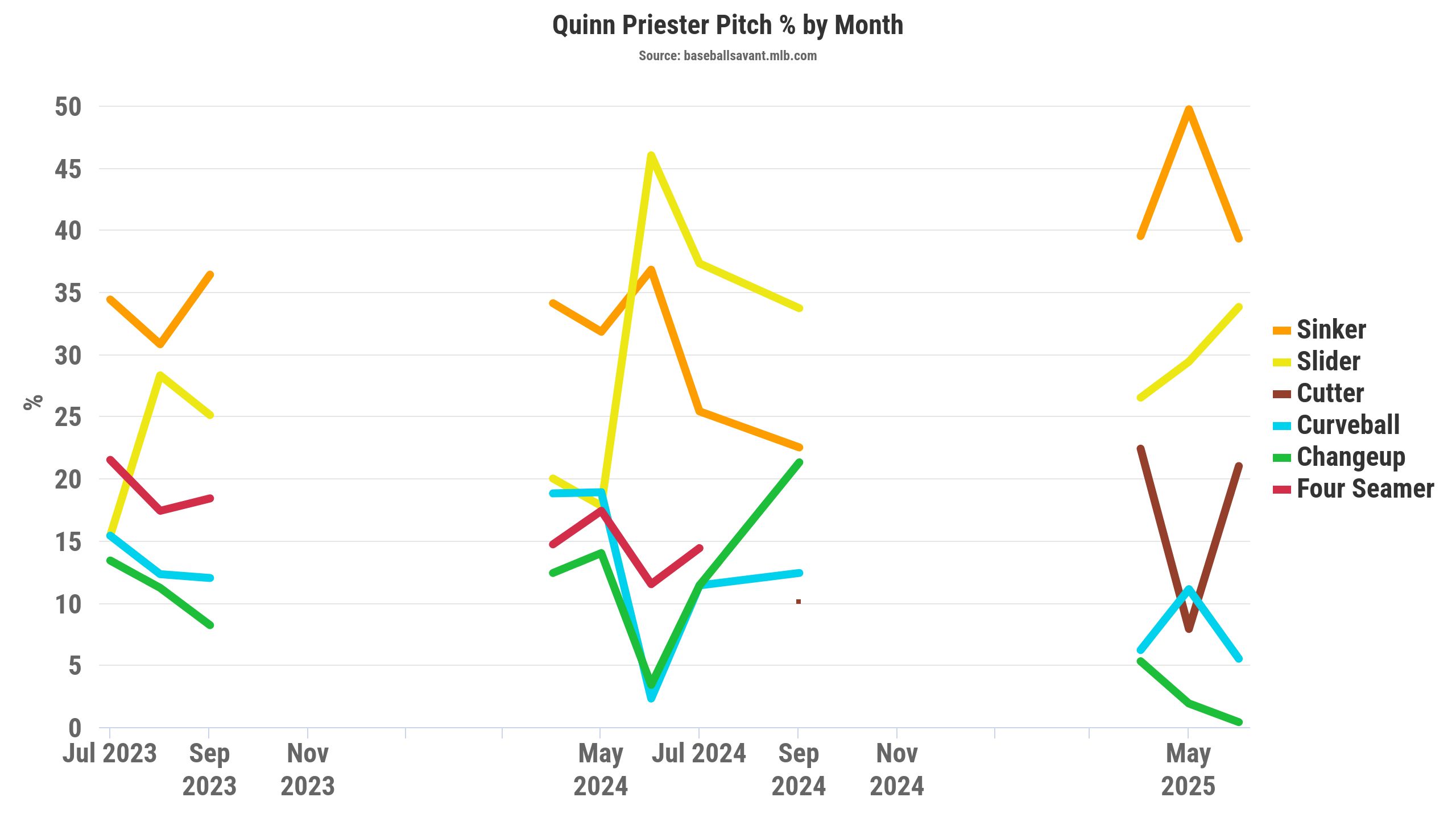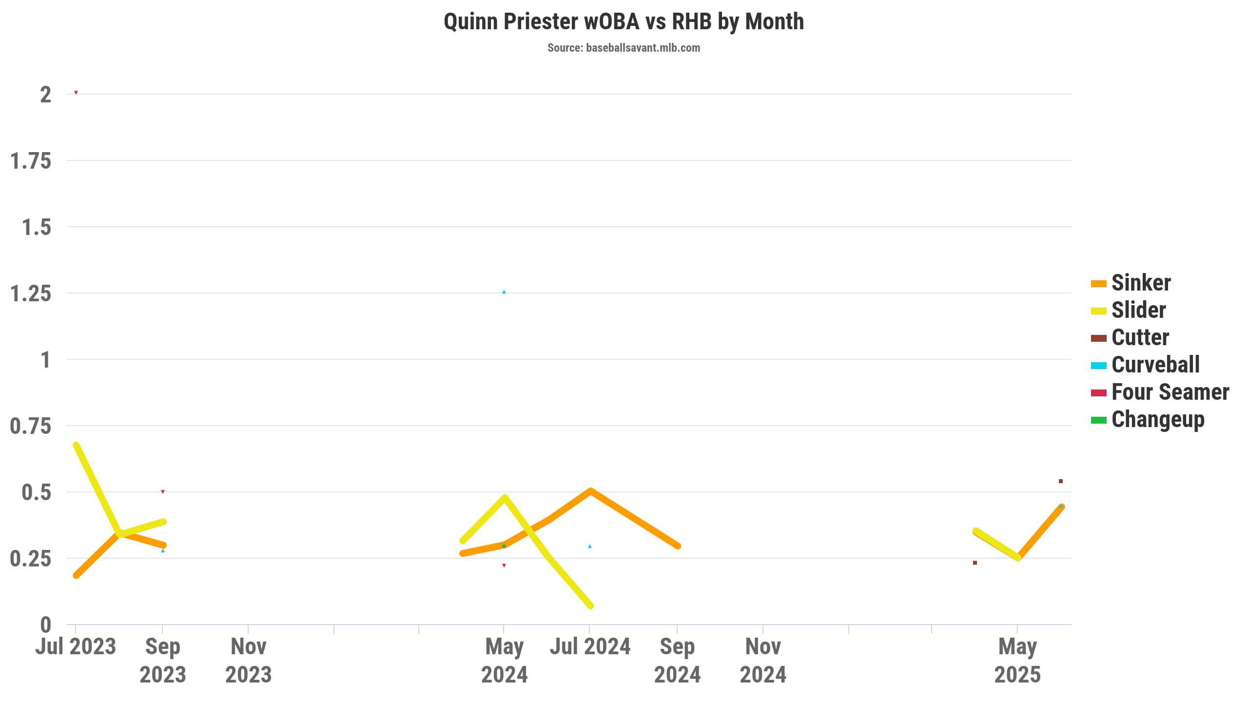 The main change involves Priester throwing more sliders and cutters while lowering the sinker usage over the past month. Priester’s sinker typically generates groundballs (63.9 percent), with decent batted ball results against right-handed hitters (.320 wOBA, .334 xwOBA) and lefties (.339 wOBA, .399 xwOBA). He has been throwing his slider to right-handed hitters, around 39-41 percent of the time, with better results in May (.250 wOBA) and June (.000 wOBA).