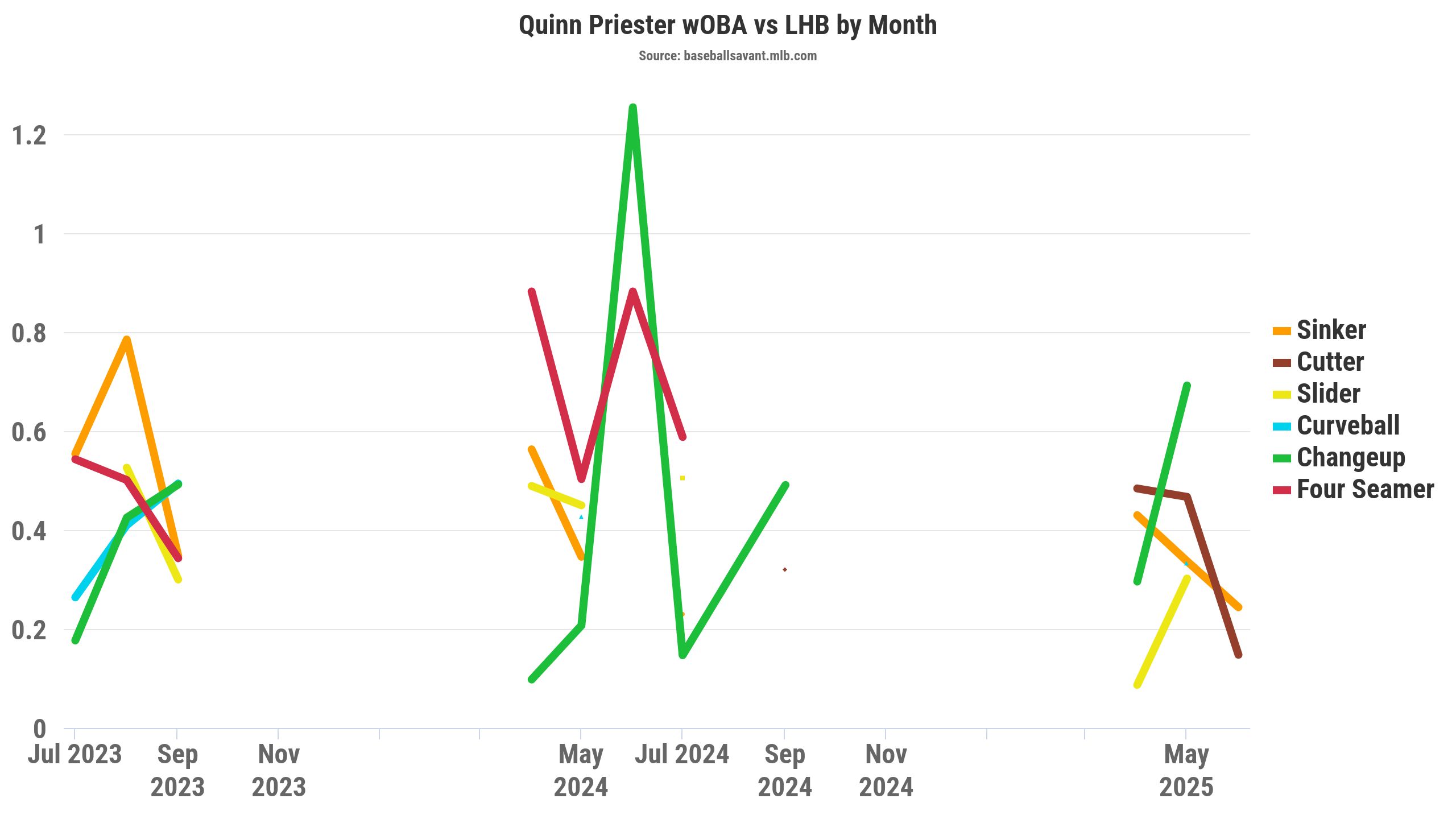 Meanwhile, Priester has been throwing the cutter more to left-handed hitters, but the results were awful (.407 wOBA, .363 xwOBA). It’s worth noting that Priester’s cutter is a newer pitch that he’s developing after throwing nine in 2024. We’ve seen the results improve in June via the cutter against left-handed hitters.