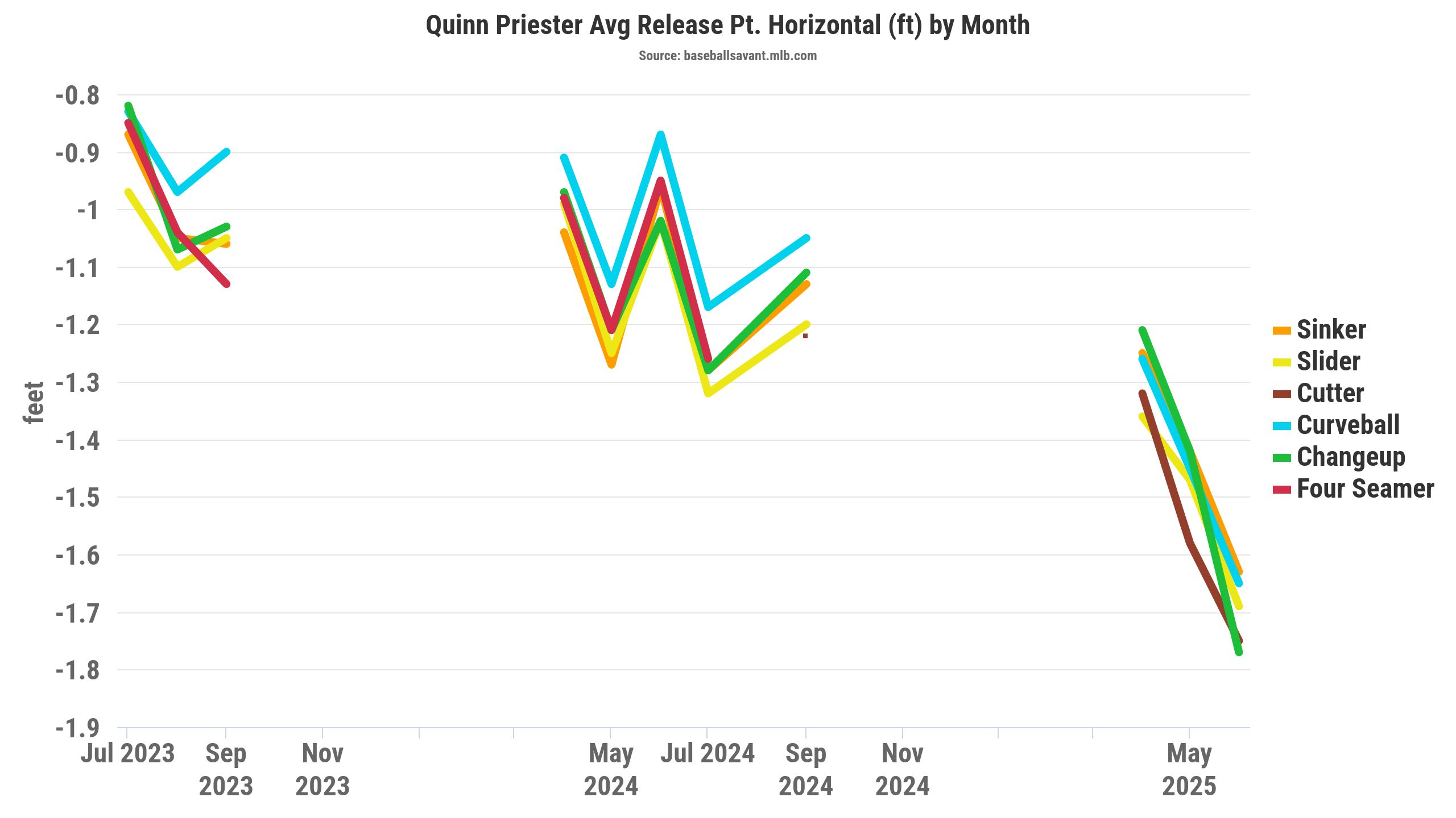 That’s evident in Priester’s cutter allowing a .484 wOBA (.457 xwOBA) in March/April, .467 wOBA (.306 xwOBA) in May, and .148 wOBA (.222 xwOBA) in June. The cutter movement fluctuated within 1-2 inches in the downward and horizontal profile throughout each month. Priester’s horizontal release points have changed by five inches in June compared to earlier in the season, a two-inch difference from May.