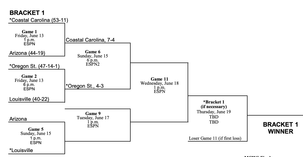 Coastal Carolina, Arizona, Oregon State, and Louisville are the four teams in Bracket 1. Coastal Carolina booked a spot in the Men’s College World Series with a sweep of Auburn in the Super Regionals, while Arizona defeated North Carolina in Game 3 of the Chapel Hill Super Regional to claim their spot.