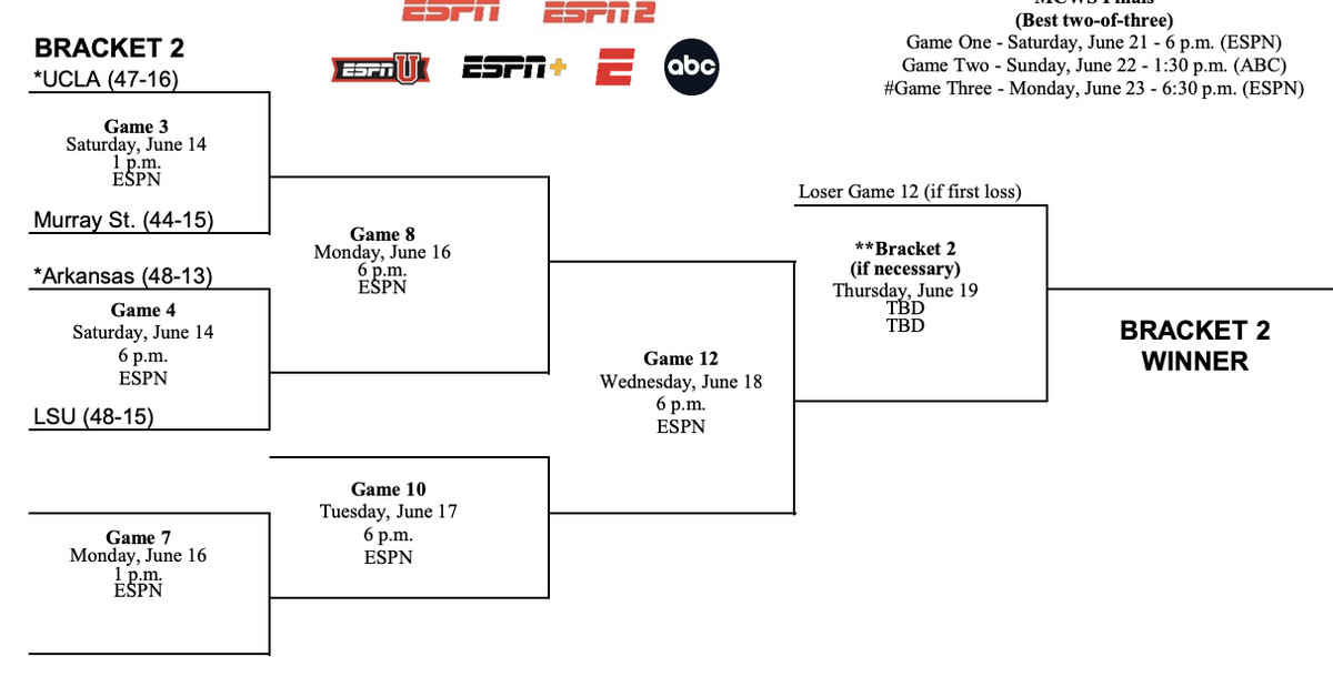 The four teams in Bracket 2? UCLA, Murray State, Arkansas, and LSU. The first three teams booked a spot in Omaha thanks to a sweep in the Super Regionals: UCLA swept UTSA to take the Los Angeles Super Regional, LSU swept West Virginia to take the Baton Rouge Super Regional, and Arkansas swept defending champions Tennessee to take the Fayetteville Super Regional.