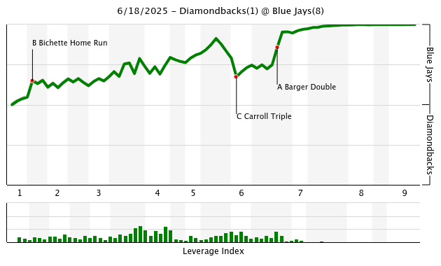 If you’ve noticed a certain paucity in offensive highlights for the D-Backs in this recap, you’re not mistaken. There weren’t many to be had tonight. Josh Naylor – who may be playing himself out of Phoenix – and Lourdes Gurriel Jr had two-thirds of the six Arizona hits as even a reconfigured lineup couldn’t make much of a difference against a posse of Toronto pitchers. For the second night in a row, the D-Backs could not find the big hit as they are just 3-for-18 with runners in scoring position in the series and have stranded an impressive 17 baserunners in the first two games. Even worse, while the top of the Toronto lineup had a combined eight hits, four walks, and six RBIs, their Arizona counterparts managed just three hits, one walk, and one RBI – a sacrifice groundout from Gurriel Jr in the sixth to plate Corbin Carroll.