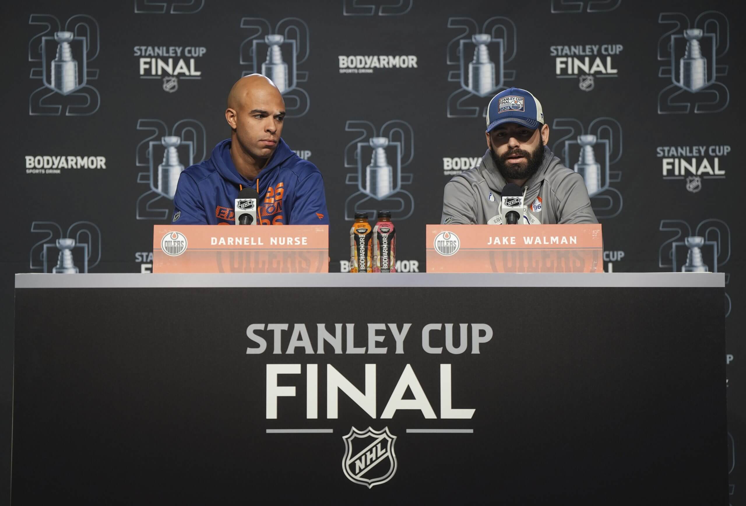 The Oilers’ Darnell Nurse, left, forewent growing a playoff beard this year. The same cannot be said for teammate Jake Walman. (Darryl Dyck / The Canadian Press via AP)