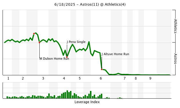 When you play the A’s, as they’re currently constructed, you should win somewhere between 60-70 percent of the time. That’s just good old-fashioned Kentucky windage, and even though I’d like to see Houston win 100 percent of the 13 contests, I’ve decided to be happy if they win 12-of-13. This was the fourth win, and there are eight games remaining in the series, including one on Thursday. See? All they need to do to make me happy is win, every day.