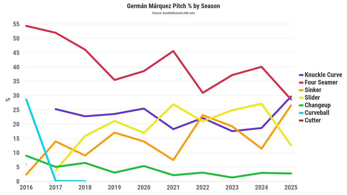 Márquez got batters to hit grounders 52.8% in 2021, while he got hitters to connect for air balls (combining fly balls, line drives, and popups) 47.2% of the time. This season, his groundball rate is a career-low 39.5% while his air rate is a career-high 60.9%. Long-lasting MLB pitchers, regardless of their surgery and health, have to evolve and adapt to have a successful career. Outs are outs, but pitchers must constantly change to get opposing hitters to produce them.