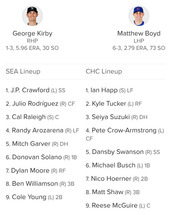 George Kirby gets the honor of toeing the slab for Seattle, hoping to bounce back from an exceedingly unusual three-walk outing on Saturday. The Cubs give us a chance to watch our old friend, Matthew Boyd. Despite being a minor contributor to the 2022 team, Boyd’s actually from the PNW, so in the deluge of celebratory clubhouse interviews on clinch night, his was one of the ones that really got to me since he was the one who really understood what the drought meant. The visual of him tearing up while Ty France laughs and pours beer on someone’s head in the background was the dichotomy that spoke to my various feelings better that anything else that day.