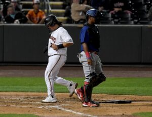 Shorebirds’ Creed Willems (35) crosses home to score against the Cannon Ballers Tuesday, April 11, 2023, at Perdue Stadium in Salisbury, Maryland. The Shorebirds defeated the Cannon Ballers 7-2.