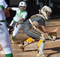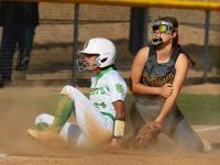 St. Joseph’s Annalyssa Cota beats the throw home to Cabrillo’s Kenslee Martin and scores for the Knights.