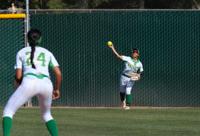 St. Joseph’s Emily Cervantes throws to Annalyssa Cota, holding Cabrillo’s Marie Terrones’ to a single after she hit the ball off the center field wall.