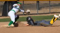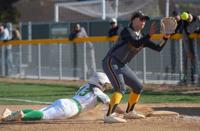 St. Joseph’s Emma Cruddas dives safely back to first base as Cabrillo’s Leila Kiesling gets the pickoff throw.