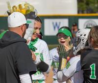 St. Joseph’s Taylor Mediano is given roses after the game against Cabrillo was stopped when the senior struck out the 600th batter of her high school career.