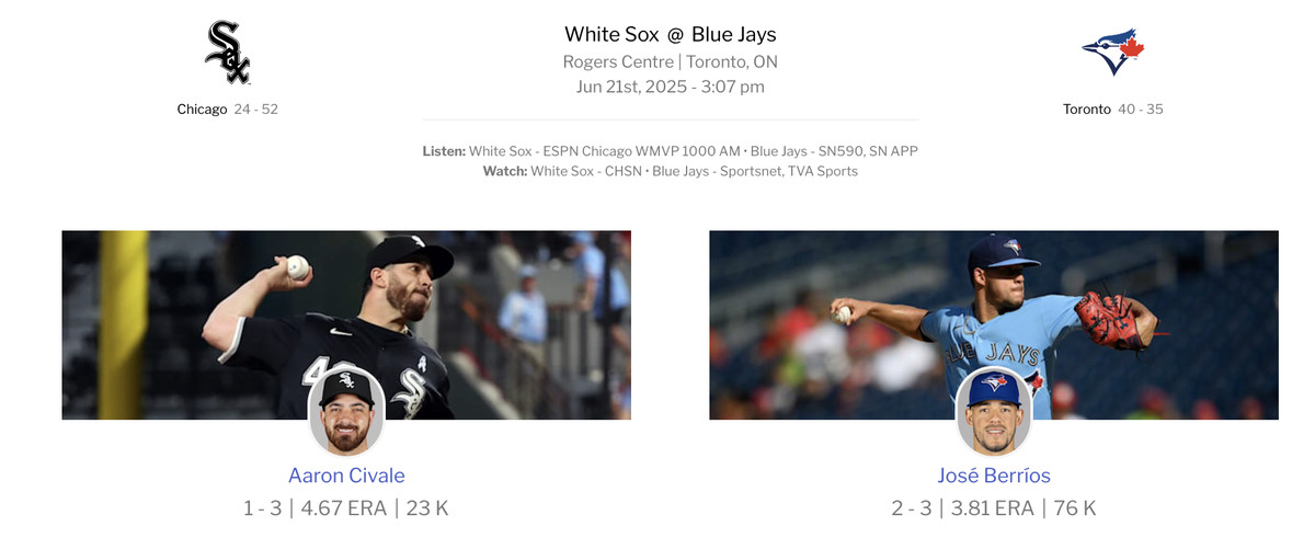 Innings-eater Aaron Civale is on the bump for his second White Sox start, while rotation stalwart José BerrÃos starts for Toronto.