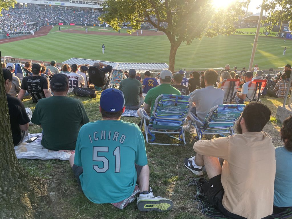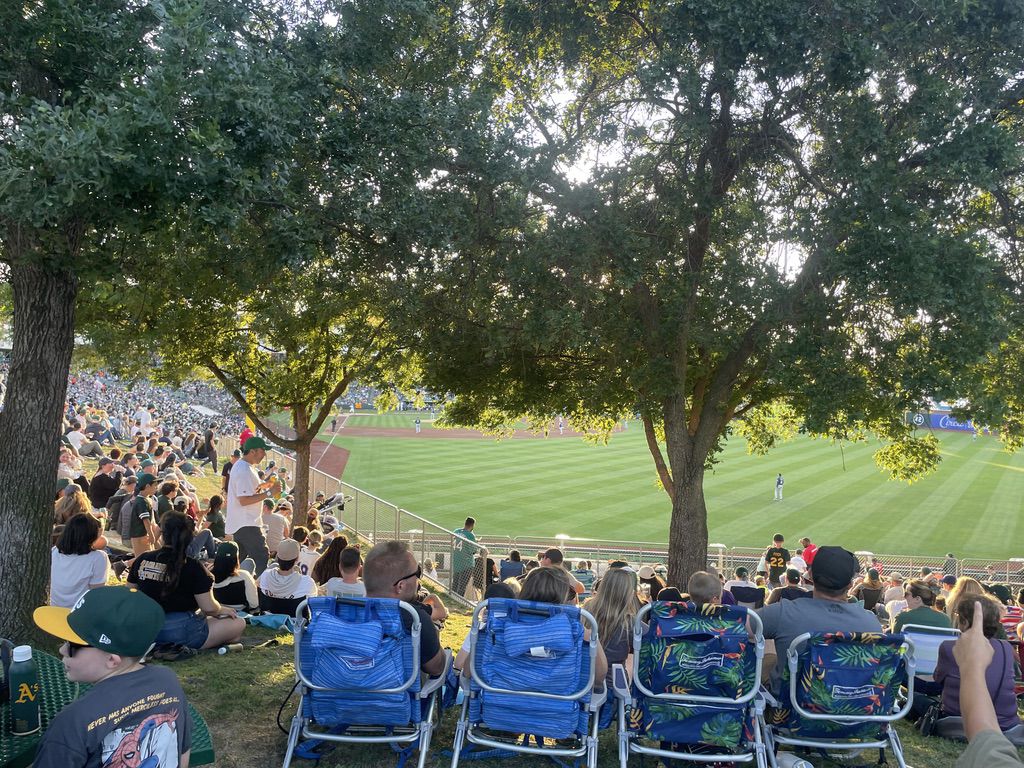You decide to take a tour of the grass hill in the outfield to round out the article. From a certain angle, you can forget that there is a baseball game happening. You sit at one of the picnic benches and eat fries and listen to the buzz of conversation beneath a canopy of leaves.