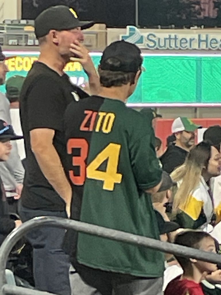 Behind you, a dad and his son are playing catch with the baseball he caught from the A’s bullpen arm.