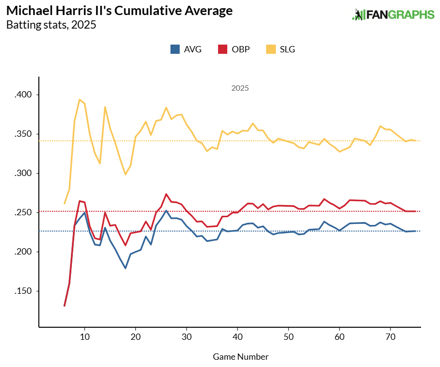 Despite his struggles in June, Harris II has actually been pretty consistent since the start of May. We can see that from his cumulative slash line throughout the season. Unfortunately, consistency isn’t a good thing in this case.