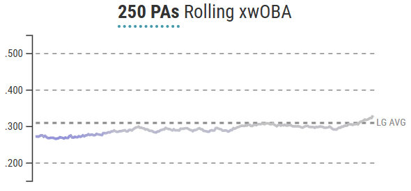 Stott ended April with a .297/.374/.436 slash line. He is hitting just .188/.278/.266 in June. However, if we look at Stott’s rolling xwOBA this season, we can see it’s been improving as the season has progressed.