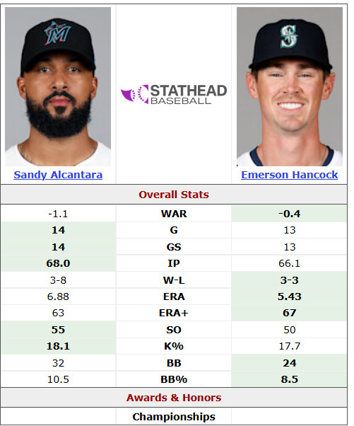 Now, the elephant in the room, Emerson Handcock and Bryce Miller. For Bryce Miller, I’m not sure if he should play the rest of the season. I’m no doctor, but these arm issues he’s been having seem to be a deeper issue than once thought. I don’t think it’s likely he will pitch much during the rest of this season. Now, Emerson Hancock is a whole different discussion altogether. The 26-year-old righty has been up and down as a spot starter for the Mariners and most recently gave up nine runs in a loss to the Cubs. I like Hancock, I think he has something that could make him an effective major league starter. This year, Hancock and Alcántara are comparable: