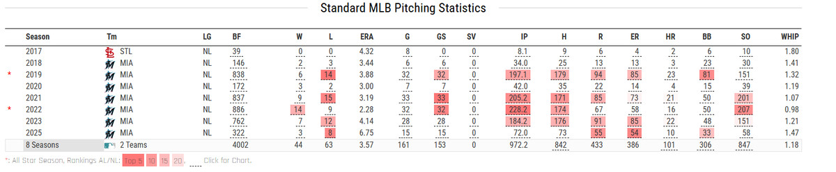 More recently, Sandy has struggled. The 2022 Cy Young winner has so far in 2025 posted a 6.88 ERA over 14 starts with 55 strikeouts and a WHIP of 1.471. Obviously, not ideal, but I don’t think any of this is unexpected. Sandy has a long history of giving up a lot of runs and being hit pretty hard, which I know is not a strong selling point, so let me explain. Throughout his career, Alcántara has finished in the top 10 in runs given up in 2019, 2021, and 2023. He also finished in the top 10 in hits given up in 2019, 2021, 2022, and 2023. That’s what happens when you are also 2nd in innings pitched from 2019-2023, trailing only Gerrit Cole, while on a team that is consistently middling at best. So, Sandy’s struggles are not entirely out of the norm. Similarly, Alcántara has been in the bottom 10% for max exit velocity every year since 2021. Still with all that, Alcántara has only posted a FIP of 4.86 this season. Is that amazing? No, can you work with that? Yes.