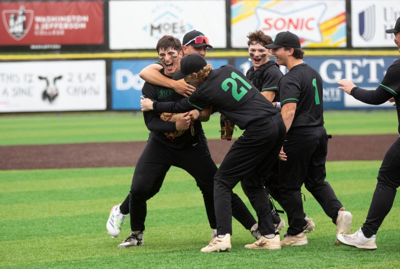 Riverside’s Zach Hare, left, celebrates with his team after tossing a perfect game against Quaker Valley in the WPIAL Class 3A championship. (Emily Matthews/Pittsburgh Union Progress)