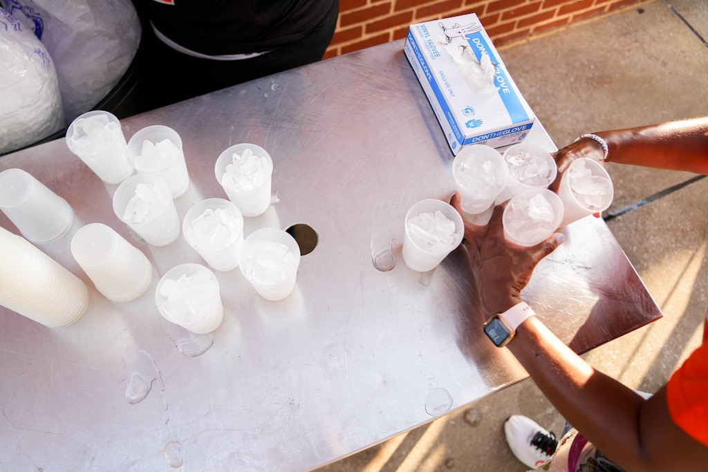 Orioles fans collect free cups of ice to cool down during the game. (Ulysses Muñoz/The Baltimore Banner)