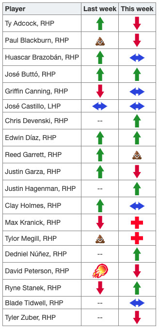 There are a lot of new names on this week’s meter. Part of the reason for that is that there are yet more new injuries to report this week. Tylor Megill and Max Kranick are both on the injured list, which resulted in some roster churn this week. Blade Tidwell took a spot start in Friday’s game and did okay—certainly better than his first major league start. He got through the first three innings with relative ease and then hit a wall in the fourth, leaving the game after just 3 2⁄3 innings. He would end up being charged with two runs. He walked three batters and struck out four in the outing.