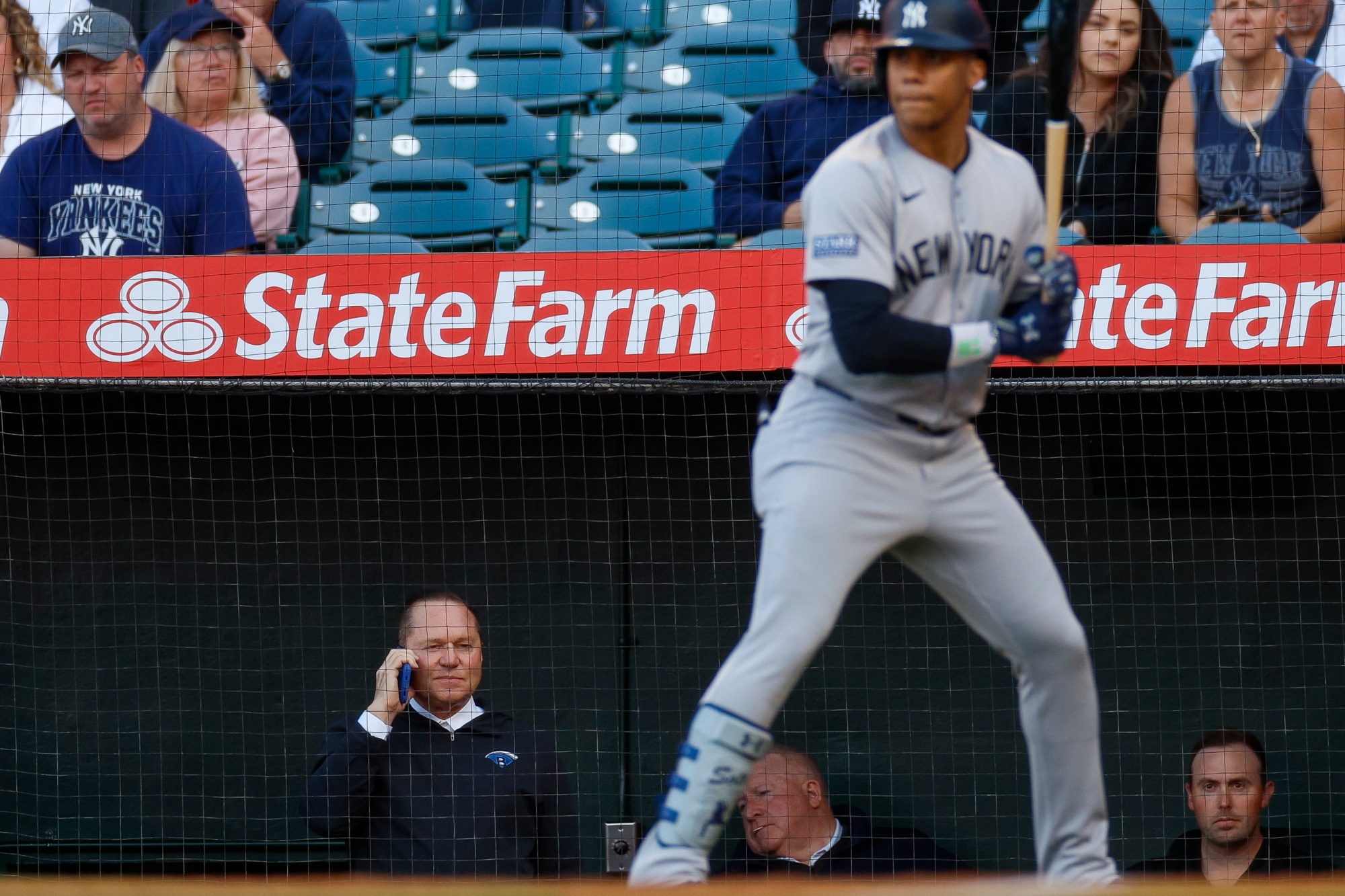 Boras watches his client, Juan Soto, during a game in Anaheim, California, in 2024. After the season, Soto signed a record 15-year, $765 million contract with the Mets. Photographer: Brandon Sloter/Getty Images