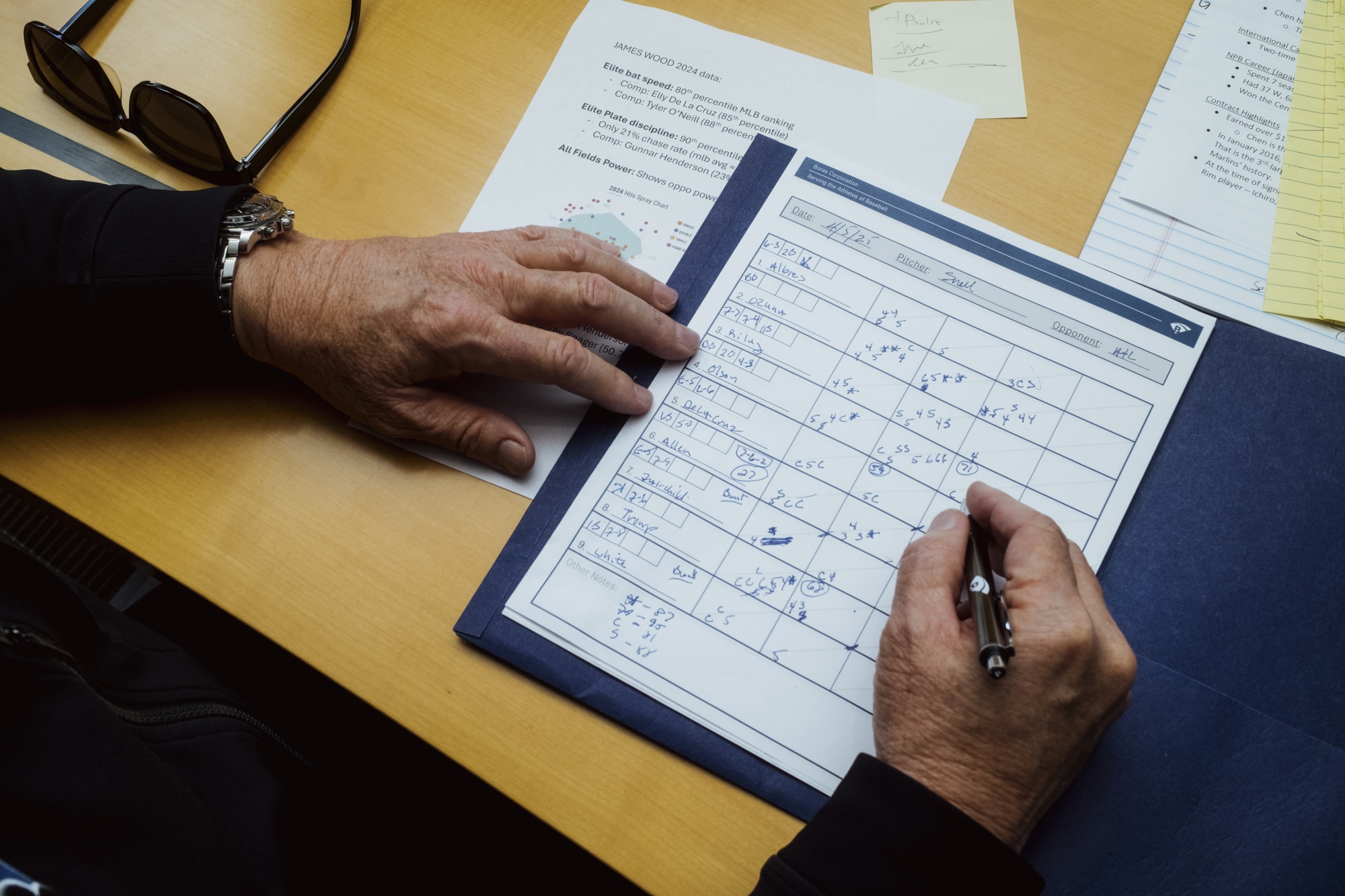 Two seats to his right, his analysts are tracking Diamondbacks ace Zac Gallen, another client, and analyzing his pitch sequences. In Boras’ lap is a blue folder filled with custom score sheets he uses to track his clients’ pitches by hand.