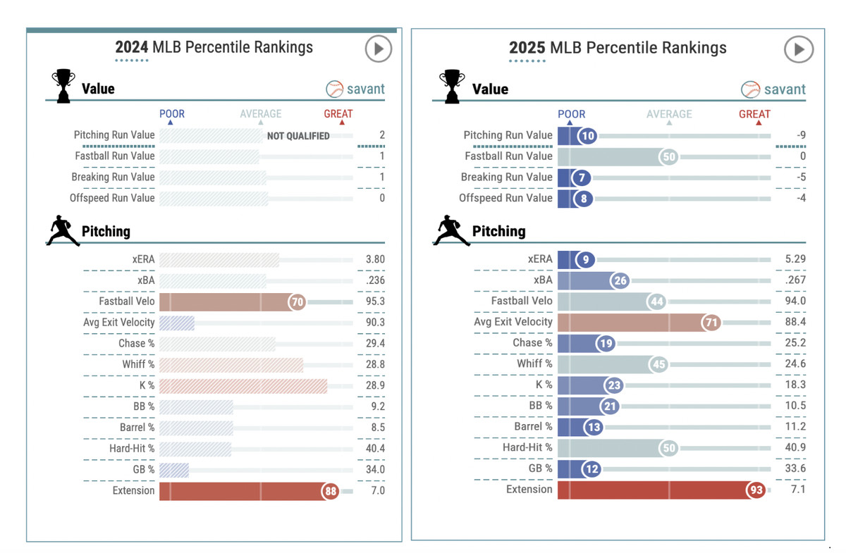 Arizona hitters can expect Burke to primarily feature a mid-90s four-seam fastball, a slider, a curveball, and occasionally a changeup and sinker. However, the red flag is that his average fastball velocity is down 1.3 mph from last year’s 95.3 mph. While his 2024 sample size was relatively small compared to the innings he’s tossed this season, the side-by-side metrics reveal a noticeable dip. Can he recapture that lost velocity and dominate, or will the D-backs feast on a slightly diminished fastball?