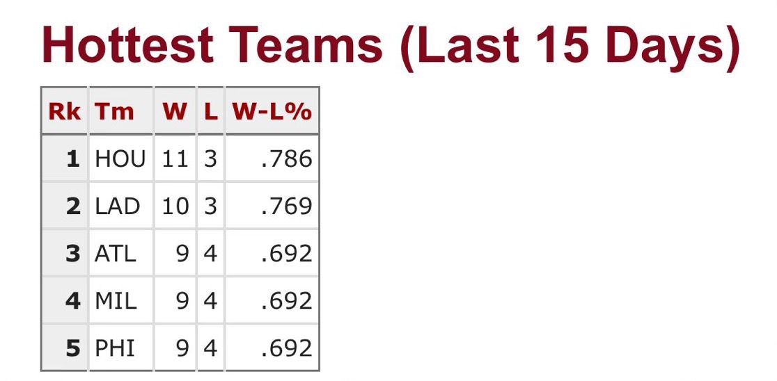 Make no mistake, the Astros have been the best team in baseball not only in the past two weeks, but the entire month of June (16-6). A pair of back-to-back shutouts against a really good Phillies team this week has certainly helped the vibes around this team. The past month has been an incredible reminder what can happen when the schedule softens and a team enters a hot streak, even when the competition improves as it did this week against the Phillies.