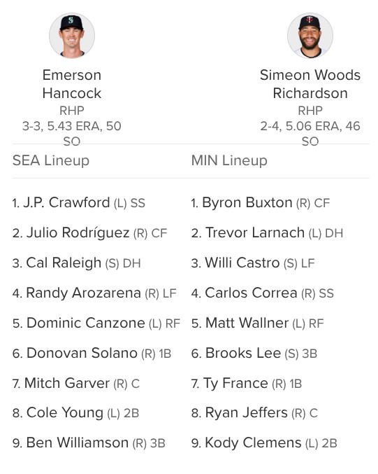 Somewhat puzzlingly, the Twins have chosen today—with fly-ball pitcher Woods Richardson—to go with their most defensively challenged outfield. Byron Buxton’s obviously as good as it gets, but if I were Minnesota, I’d want Harrison Bader and Trevor Larnach in the corners today rather than Willi Castro and Matt Wallner. Since Castro plays everyday giving roving days off, it seems like it would have been a better fit for them to use him at third today and left field yesterday. Hopefully the Mariners can pounce on the mistake.