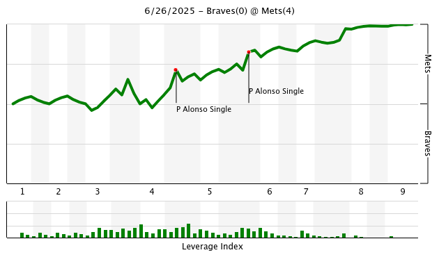 That proved to be plenty for the Amazins, whose bullpen continued to shine. Ryne Stanek pitched a 1-2-3 eighth inning with a strikeout, and after the Mets went down in order in the bottom of the frame, Edwin Díaz came on to finish things off in the ninth. He allowed a two-out single to Matt Olson—the first Braves baserunner since the fourth inning—but otherwise shut Atlanta down to end the game. It concluded a remarkable game for the relief corps following the Canning injury, as they combined for 6.1 scoreless innings with two hits, no walks, and eight strikeouts.