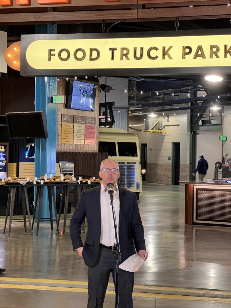Tom Hecht, Brewers Vice President of Consumer Experience in front of the Food Truck Park at American Family Field